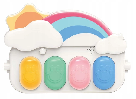 Na przestawianej poręczy zawieszone są zabawki w formie sympatycznych zwierzątek, które zachęcają malucha do chwytania i ćwiczenia koordynacji ręka–oko. Panel świetlno-dźwiękowy w kształcie chmurki z tęczą pobudza ciekawość i rozwija zmysły dziecka, a lusterko wspiera świadomość własnego odbicia.