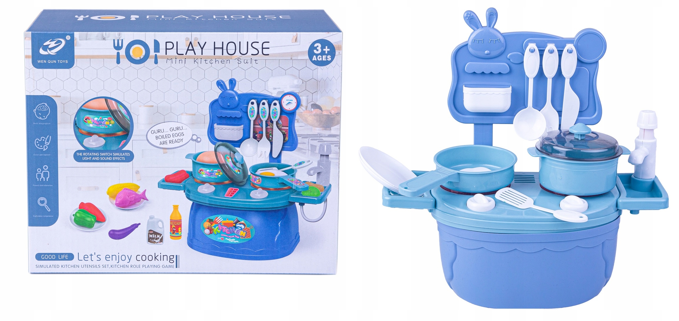 Mini Kuchnia Garnki Kuchenka Światło Dźwięk Kran Warzywa Owoce 19 Elementów