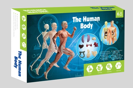 Zawartość zestawu: model anatomiczny ludzkiego ciała do samodzielnego złożenia, figurka skóry, elementy szkieletu i narządów wewnętrznych