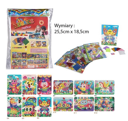 MOZAIKA WYKLEJANKA + DIAMENCIKI MIX OBRAZKÓW *12 CENA ZA KOMPLET zawrtość sztuki : kolorowy szablon z rysunkiem, 4 kompl. naklejek brokatowych ,1 pastelowa+ diamentowe kwiatki, diamentowe okręgi. Wzory :paw, auto,łódż podwodna,pegaz,rybka,słoń cyrkowy,,