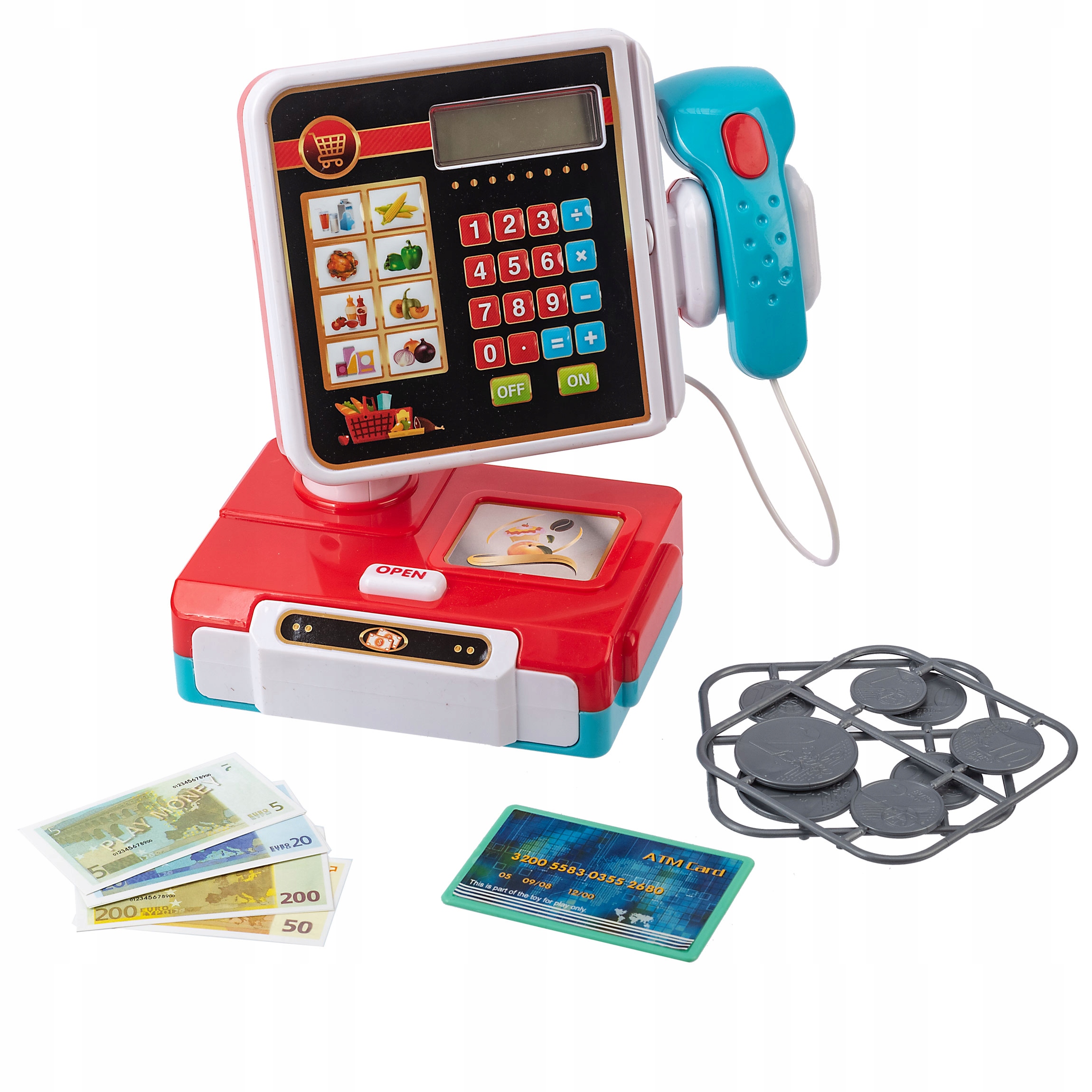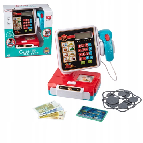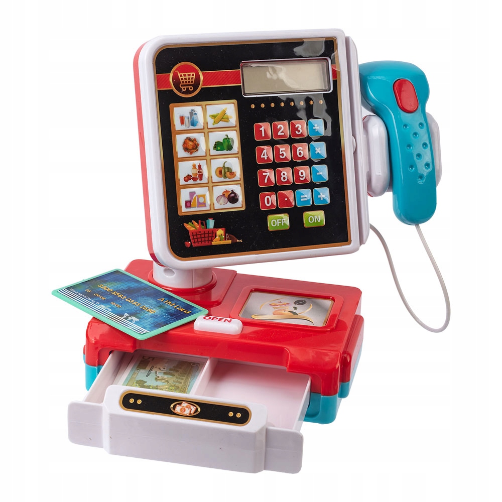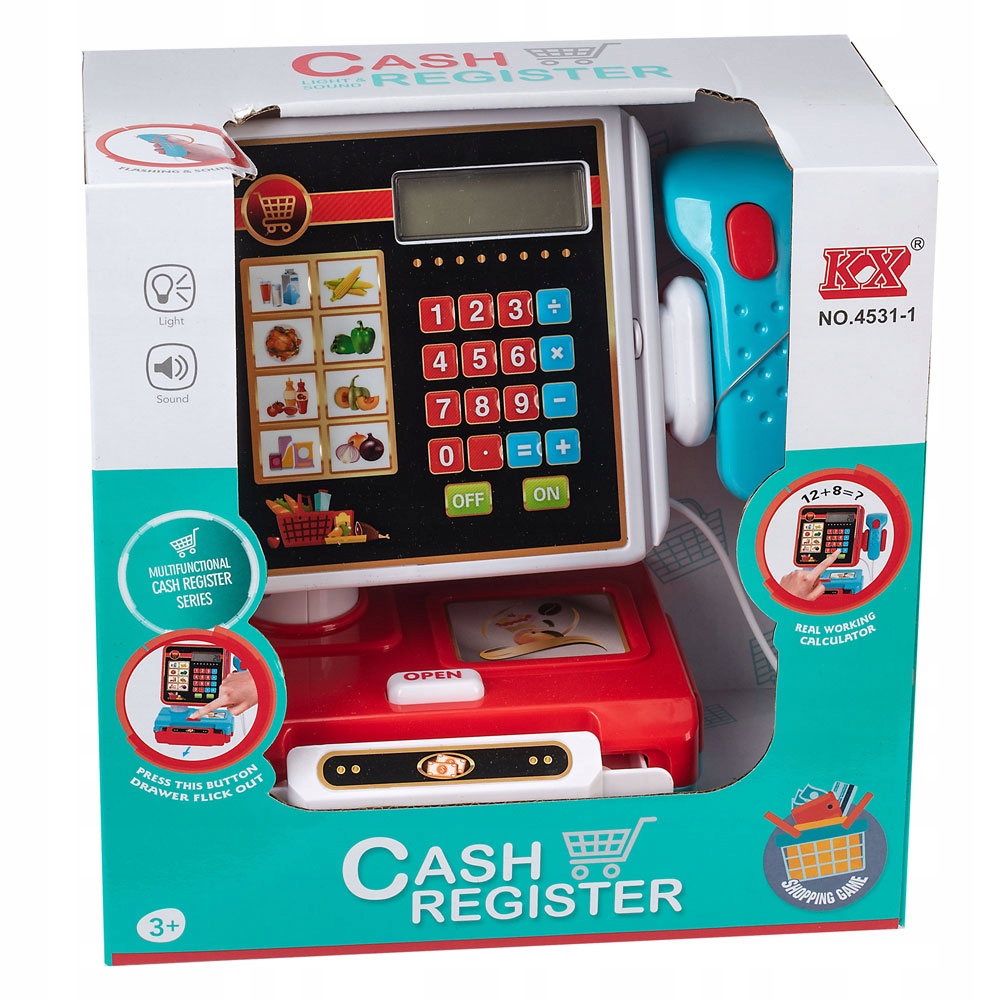 Kasa sklepowa dla dzieci zbudowana z najwyższej jakości materiałów, cechująca się dbałością o szczegóły. Wyposażona w klawiaturę z różnorodnymi przyciskami (liczby i znaki matematyczne), czytnik kart płatniczych oraz skaner. Funkcjonalność uzupełnia specjalna szuflada na monety, otwierana za pomocą jednego z wielu przycisków. Dzięki realistycznemu skanerowi dzieci mogą imitować skanowanie produktów, a nadruki na akcesoriach dodają autentyczności.