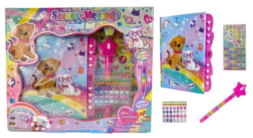 PAMIĘTNIK SEKRETNY Z NIEWIDZIALNYM TUSZEM PIESEK I KOTEK, pak 24, w zestawie: notes 200 stron zamykany na tajny kod, 1 specjalny długopis z niewidzialnym tuszem i latareczką, 1 zestaw naklejek, 1 zestaw diamentów. Wymiary pamiętnika : 13,5 x 15 x cm, W