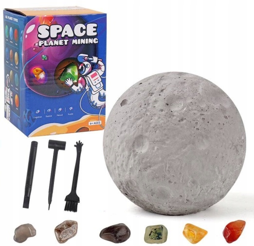 W zestawie znajdują się dłuto, miotełka i młoteczek, dzięki którym dziecko może poczuć się jak prawdziwy odkrywca, stopniowo wydobywając ukryte wewnątrz kamienie. Proces eksploracji sprawia, że zabawa jest angażująca i pełna emocji, a każdy znaleziony kamień staje się małym sukcesem. Interaktywna forma zabawy pobudza ciekawość i zachęca do zadawania pytań, co czyni skamielinę świetnym narzędziem edukacyjnym dla dzieci interesujących się kosmosem i geologią.
