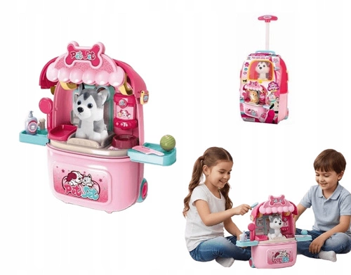 Walizka z wysuwaną rączką pełni rolę mobilnego zestawu, który po otwarciu zmienia się w salonik pielęgnacyjny dla psa. W komplecie znajduje się uroczy pluszowy piesek oraz akcesoria, takie jak miseczki, szczotki czy zabawkowe kosmetyki, dzięki którym dziecko może odgrywać scenki i rozwijać swoją wyobraźnię.