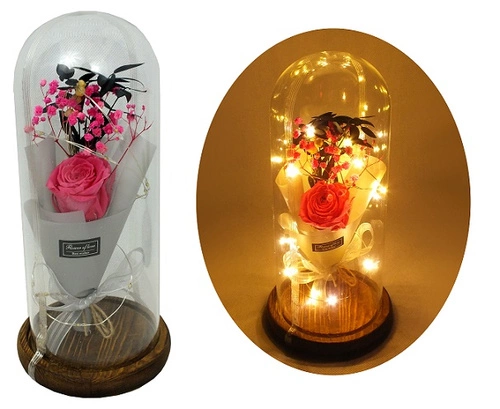 RÓŻA - BUKIET ŚWIATŁO LED DREWNIANA PODSTAWA SZKLANA KAPSUŁA / 24 ŚWIATŁO CIĄGŁE