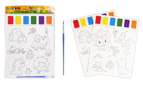 Wymiar : 32,5cm x 22cm, pędzelek w zestawie, farbki są w postaci brawników dołączynych do rysunku, 6 kolorów farbek, 2 rysunki w komplecie
