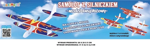 SAMOLOT STYROPIANOWY Z SILINICZKIEM ŁADOWANIE USB KARTON /192/12 Wymiary produktu 28x29x5 cm ; Wymiary op 31x8,5x2,5 cm; Waga displaya 0,876 kg szt 0,057 kg