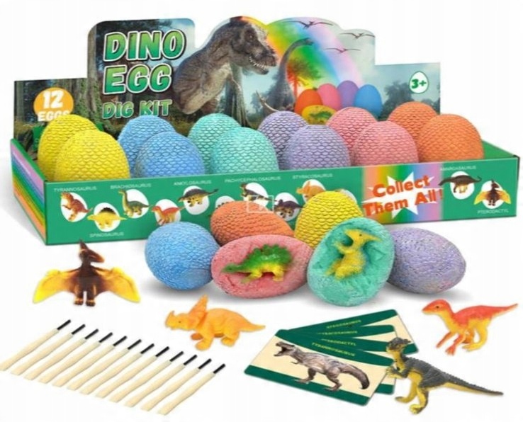 Zawartość zestawu: 12 jajek z dinozaurami, dłutka, karty z nazwami dinozaurów