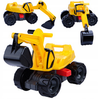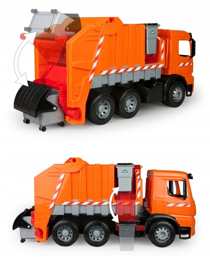 Ten ogromny pojazd ma kilka funkcji. Może jeździć na kółeczkach, pchany raczkami dziecka. Ten model dodatkowo można ozdobić , dołączonymi naklejkami. Ma zbiornik do przewożenia ,,śmieci ", ale może tam być przewożony piach, klocki. Z tyłu i boku pojazdu , przy jego głównym pojemniku, znajdują się mechanizmy przechyłowe do wysypu śmieci z kubłów. . Dwa typy kubłów : podstawowy mały z klapą i kontener na kółkach- dołączone do zestawu.
