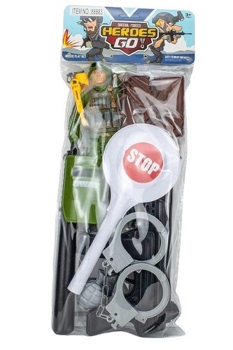 w zestawie figurka, granat, kajdanki, lizak,