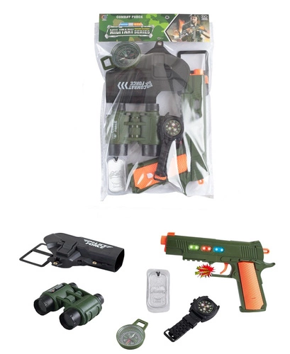 w zestawie nieśmiertelnik, lornetka, kopas, zegarek, kabura i pistolet ze światłem i dźwiękiem,