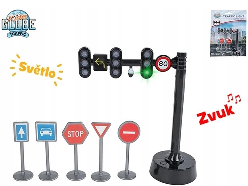 SYGNALIZATOR ŚWIETLNY + 5 ZNAKÓW DROGOWYCH W ZESTAWIE Światła zmaieniają się na zmianę. Sygnalizacja wydaje rzeczywiste dźwięki. opakowanie-pleksa