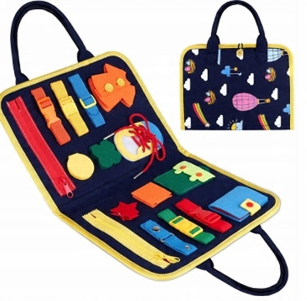 Zawartość zestawu: tablica manipulacyjna w formie walizki z elementami edukacyjnymi: ubranko na guziki, bucik do wiązania, kieszonki, paski z klamrami, suwaki i zatrzaski