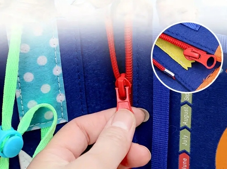 Klamry zaciskowe, suwaki, guziki oraz kolorowe kształty na rzepy zapewniają nie tylko zabawę, ale również uczą dziecko podstawowych umiejętności, takich jak zapinanie, przesuwanie czy sortowanie. Elementy takie jak pasek do rozciągania czy kieszeń na zatrzask dodają do zestawu elementu interakcji, zachęcając do eksploracji i odkrywania.