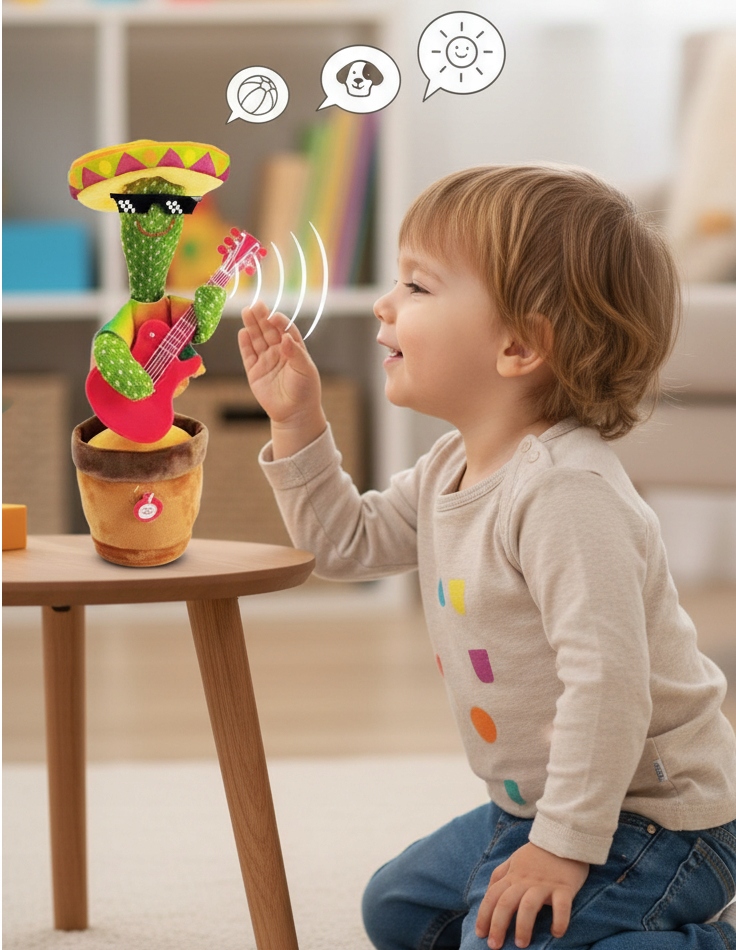 Zabawka posiada funkcję powtarzania dźwięków, dzięki czemu każde słowo wypowiedziane przez dziecko zostaje zabawnie odtworzone w zmodyfikowanej wersji. Miękki pluszowy materiał i wysoka jakość wykonania zapewniają bezpieczeństwo podczas zabawy, a solidnie przyszyte elementy, takie jak kapelusz, gwarantują trwałość na długi czas. Plastikowa gitara dodaje całości charakteru, czyniąc z kaktusa prawdziwego scenicznego artystę.