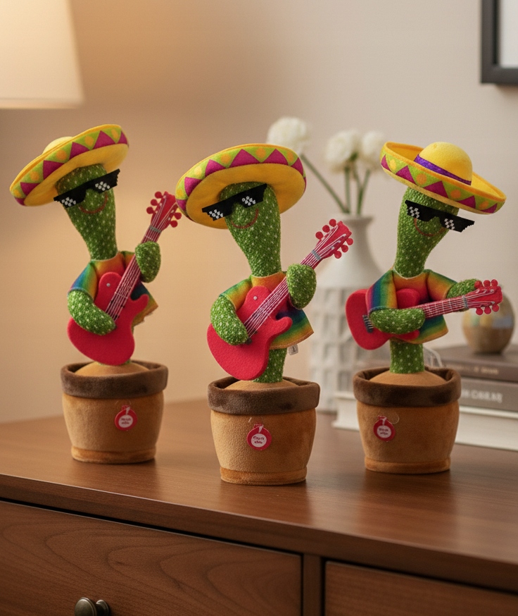 Rozśpiewany kaktus z gitarą to zabawka, która potrafi rozbawić każde dziecko i wprowadzić do domu pozytywną energię. Jego wyjątkowy wygląd z kolorowym ponczo, czerwonym instrumentem i dużym sombrero sprawia, że przyciąga uwagę już od pierwszego spojrzenia. Podczas zabawy kaktus nie tylko tańczy w rytm melodii, ale również wydaje dźwięki, które zachęcają do wspólnego śpiewania i poruszania się w takt muzyki.