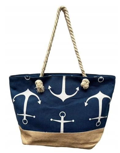 TORBA PLAŻOWA/MIEJSKA KOTWICE CIEMNA, pak 240, różne wzory z morskim motywem, kotwice na ciemnym tle, uchwyty ze sznurków wymiary 56 x 16 x 36 cm