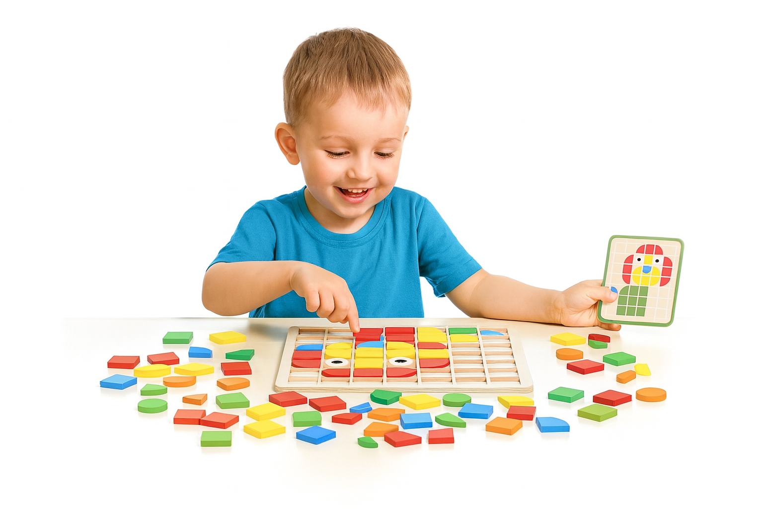Zabawa mozaiką to świetny sposób na naukę rozpoznawania barw, kształtów oraz ćwiczenie koordynacji ręka-oko. Dzieci uczą się cierpliwości i koncentracji, jednocześnie czerpiąc satysfakcję z tworzenia własnych kompozycji. Solidne, drewniane elementy są bezpieczne i trwałe, co sprawia, że zabawka posłuży przez długi czas.