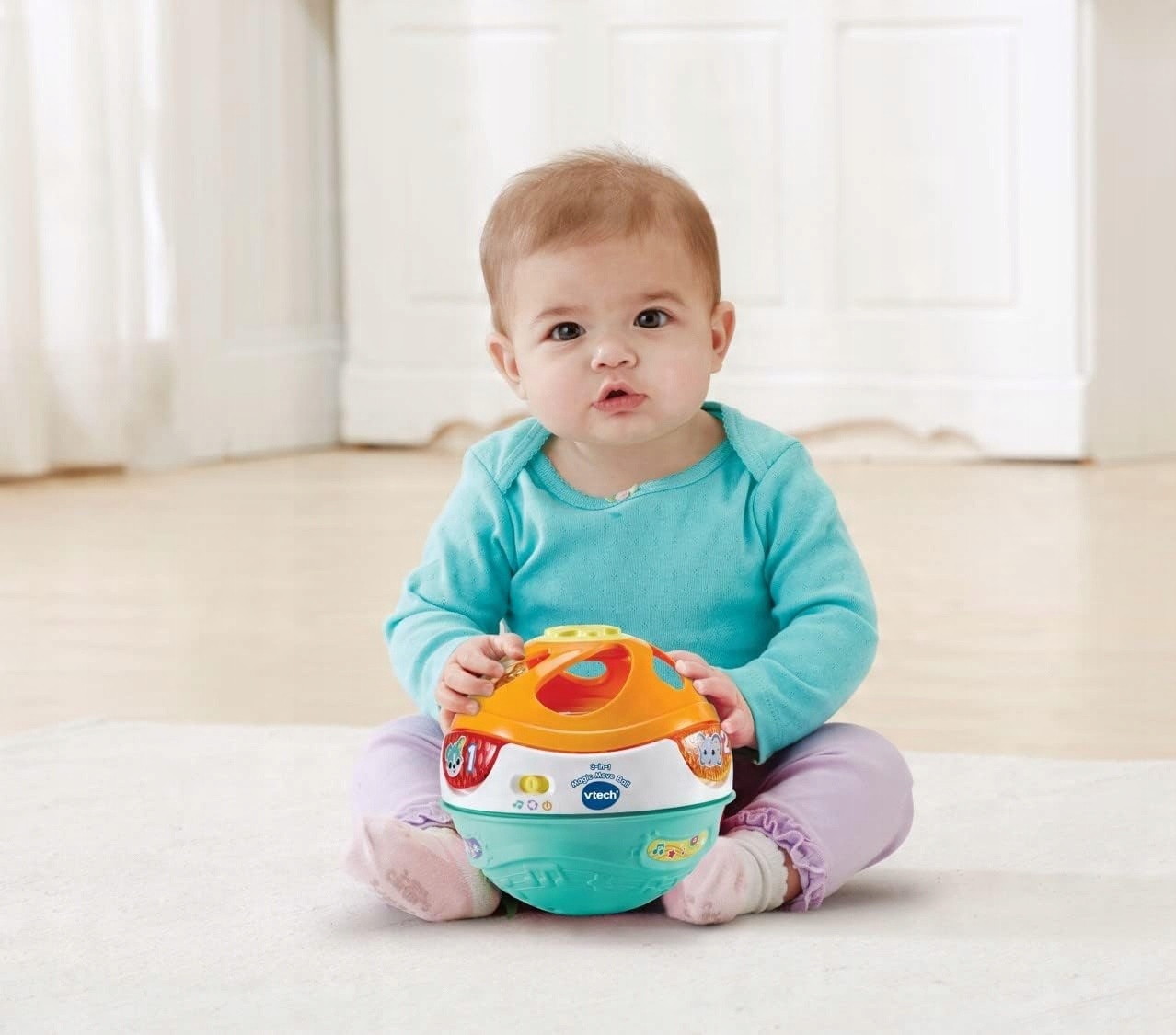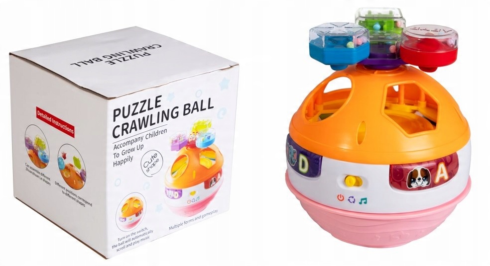 Po przekształceniu sorter zamienia się w pianinko z melodyjkami, które uatrakcyjnia zabawę i wprowadza dziecko w świat dźwięków. Wbudowane przyciski z nazwami liter oraz zwierząt w języku angielskim wspomagają naukę podstawowych słów, rozwijając zdolności językowe i słuchowe malucha. Dodatkową atrakcją jest możliwość włączenia ruchu obrotowego, co dodaje dynamiki i zachęca dziecko do aktywnej zabawy.