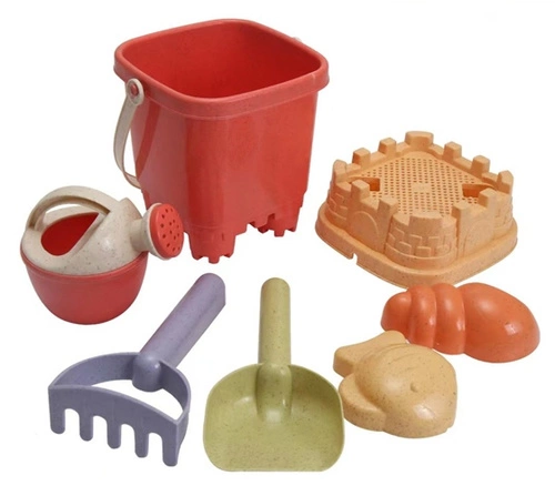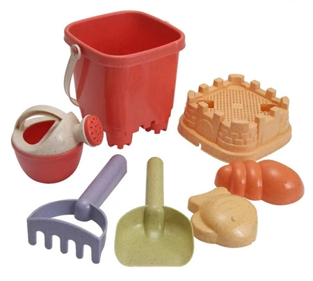 w zestawie wiaderko i nakładka sitko w kształcie zamku, konewka, grabki, łopatka i dwie foremki,