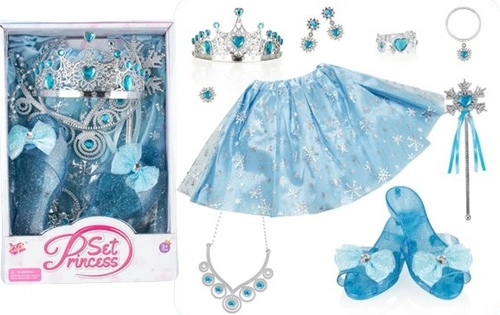 zawartość zestawu: spódniczka, diadem, kolczyki, broszka, bransoletki, wisiorek, berło, pantofelki