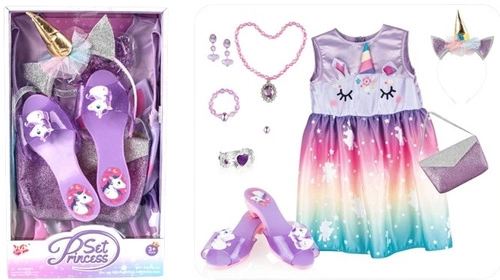 zawartość zestawu: tęczowy strój, opaska z rogiem, kolczyki, broszka, bransoletka, wisiorek, torebka, pantofelki