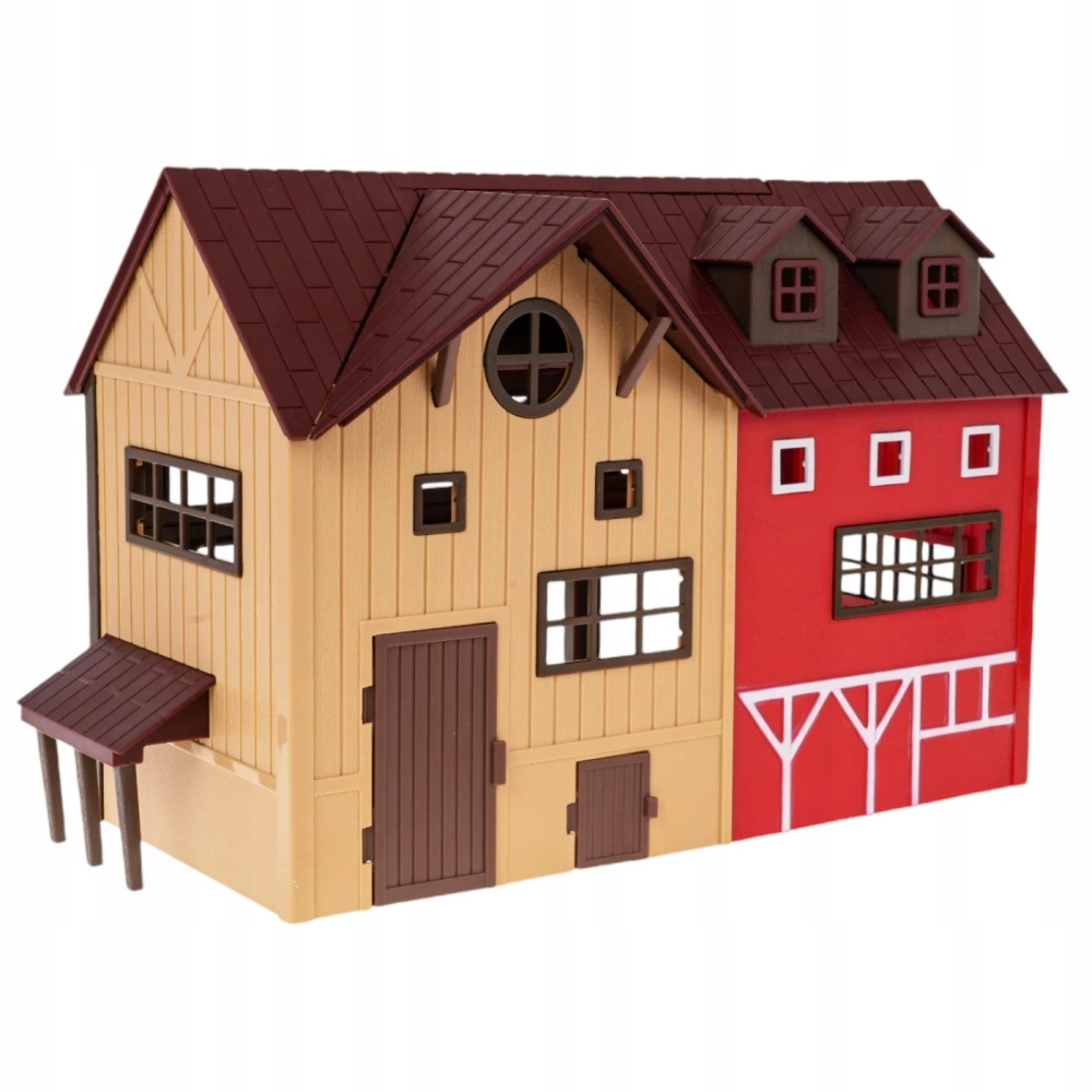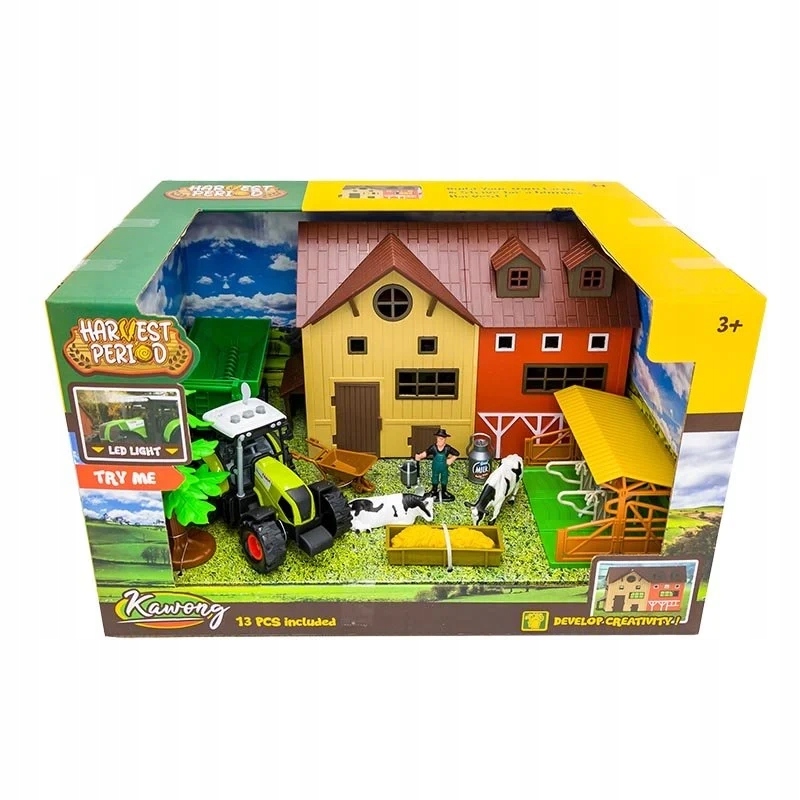Zawartość zestawu: dom, dojarnia, figurki zwierząt i wyposażenia, drzewo, taczka, traktor z wozem