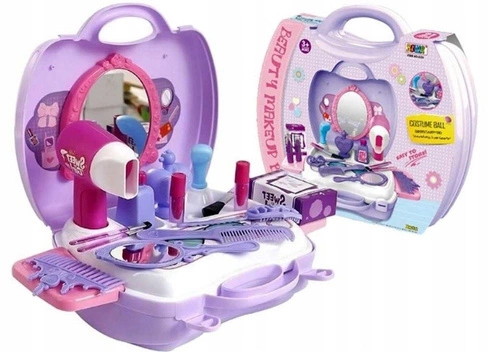 Lekki i praktyczny design sprawia, że zabawkę można z łatwością zabrać ze sobą na wycieczkę lub do koleżanki, zapewniając niekończącą się rozrywkę. W zestawie znajdziesz aż 21 różnorodnych elementów, w tym: elegancką, fioletową walizeczkę, która po otwarciu zamienia się w urokliwy salon fryzjerski, suszarkę, lusterko do dokładnego oglądania efektów, delikatny grzebień i szczoteczkę do włosów, kolorowe spinki, małą buteleczkę na lśniący lakier do włosów oraz urocze nożyczki fryzjerskie i wiele innych akcesoriów.