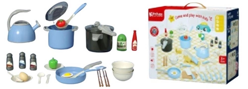 ZESTAW KUCHENNY 32 ELEMENTY NIEBIESKI KARTON PAK 16 zestaw składa się z czajnika, granków, zastawy, przyborów kuchennych, przypraw, jajka i warzyw wymiar kartonu: 23,5 x 3 x 23,5 cm