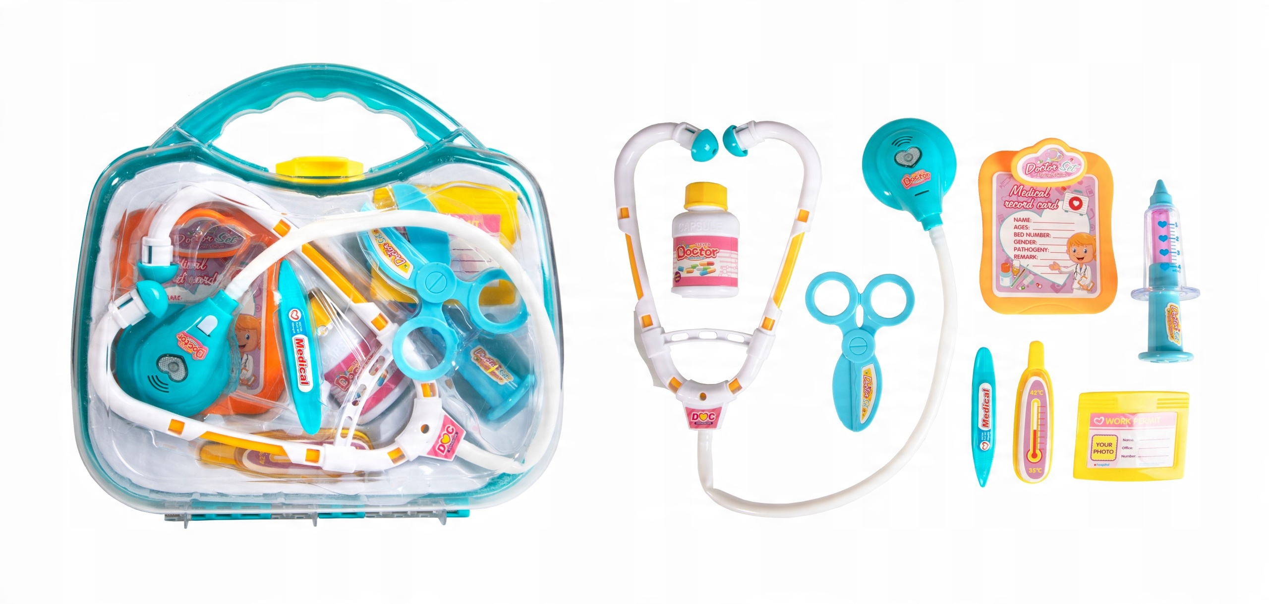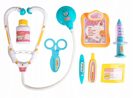 Zestaw zawiera 8 elementów, które pozwalają na odgrywanie różnych scenariuszy medycznych. Stetoskop, strzykawka, termometr, nożyczki oraz podkładka umożliwiają symulowanie badań, diagnozowanie pacjentów i leczenie ulubionych pluszaków czy członków rodziny. Kolorystyka utrzymana w odcieniach niebieskiego nadaje zabawce profesjonalny wygląd, który dodatkowo zachęca dziecko do nauki poprzez zabawę.