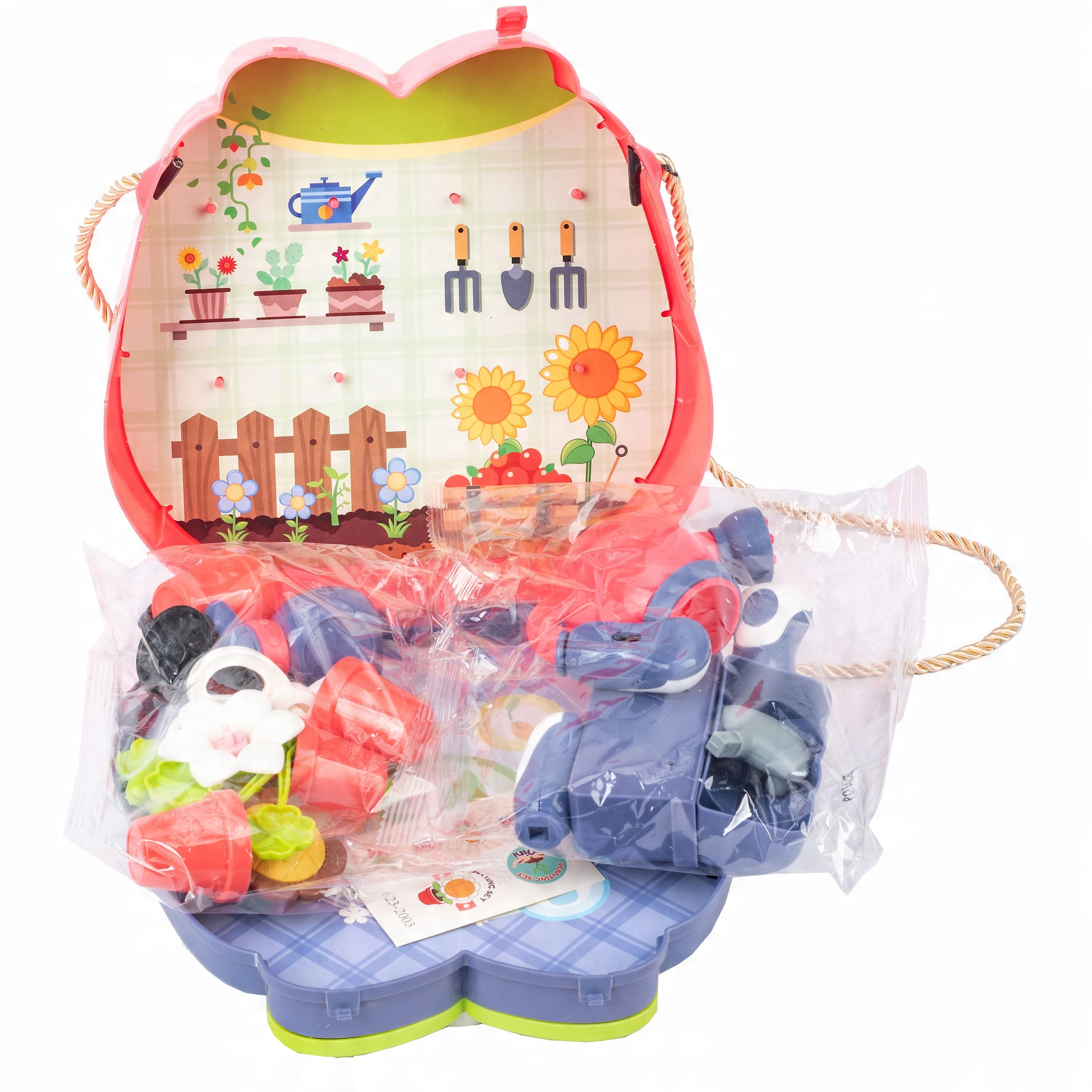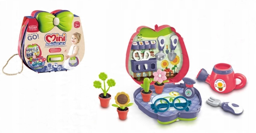 Zestaw zawiera 13 elementów, które pozwalają na różnorodne aktywności i rozwijają wyobraźnię dziecka. W skład zestawu wchodzą okulary, konewka, spryskiwacz, nożyczki oraz dekoracyjne kwiaty, dzięki czemu maluch może bawić się w podlewanie, przycinanie i pielęgnowanie roślin.