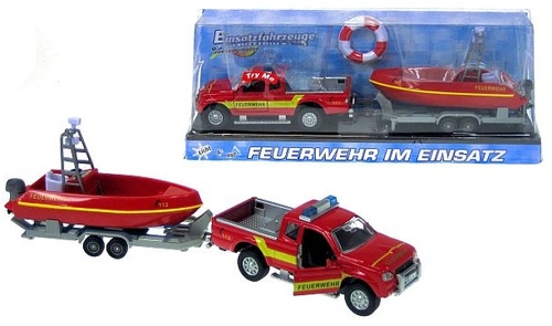 Zestaw pojazdów AUTO STRAŻ POŻARNA 12 CM Z ŁODZIĄ ŚWIATŁO DŹWIĘK