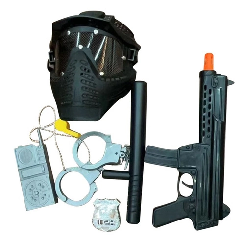 w zestawie odznaka, maska, gwizdek, krótkofalówka, pałka i karabin napędzany terkotką,
