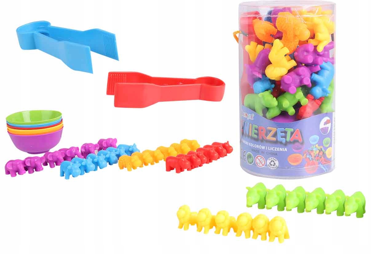 Zawartość zestawu: 2 szczypce, 6 kolorowych misek, po 5 zwierzątek w odpowiednich kolorach: owca, lew, słoń, nosorożec, hipopotam